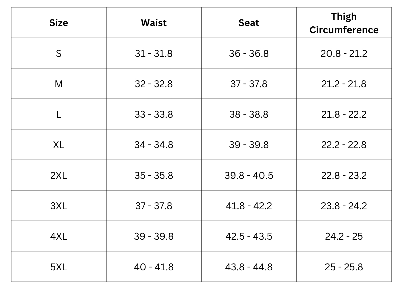 Size Chart (inches):