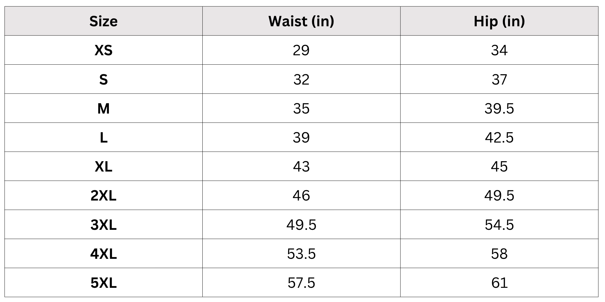 Size Chart (Inches):