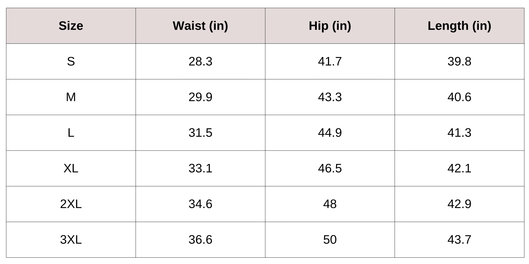 Size Chart (Inches):