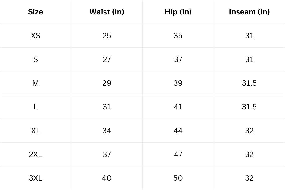Size Chart (Inches):