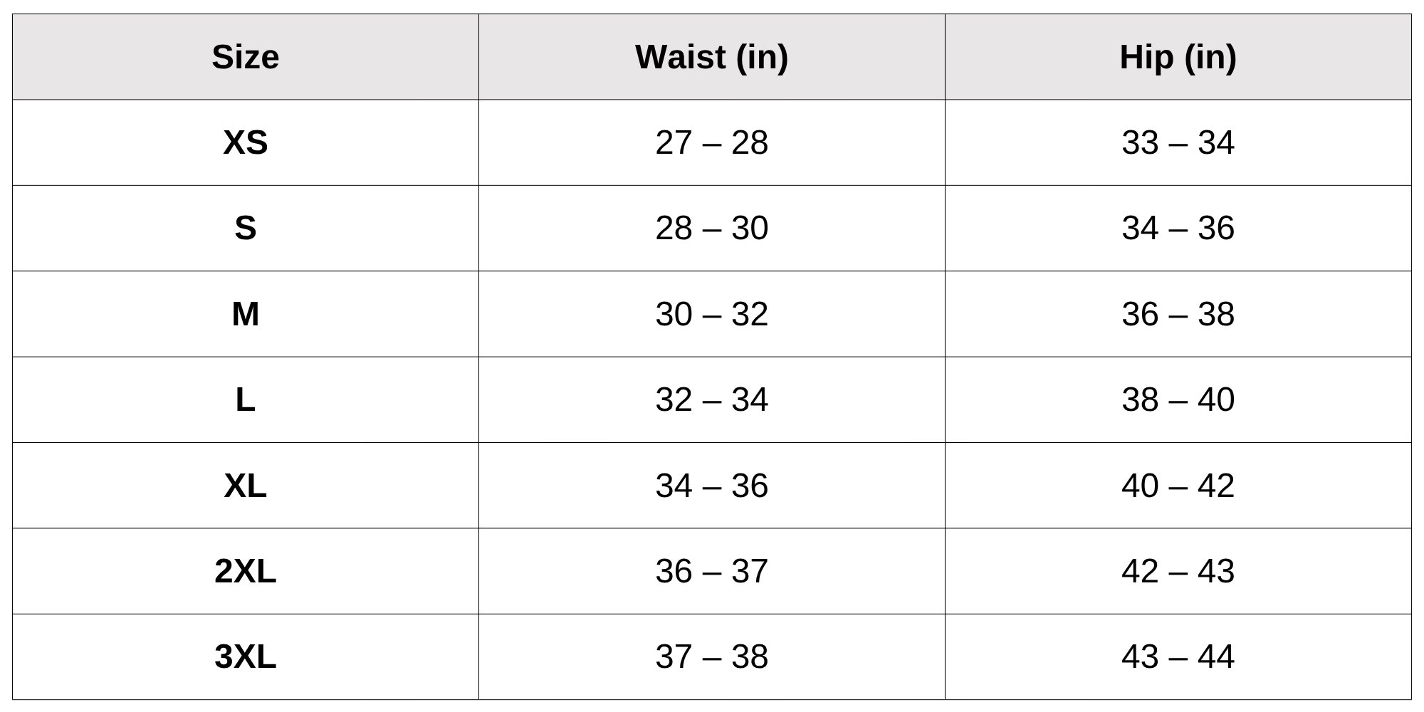 Size Chart (inches):
